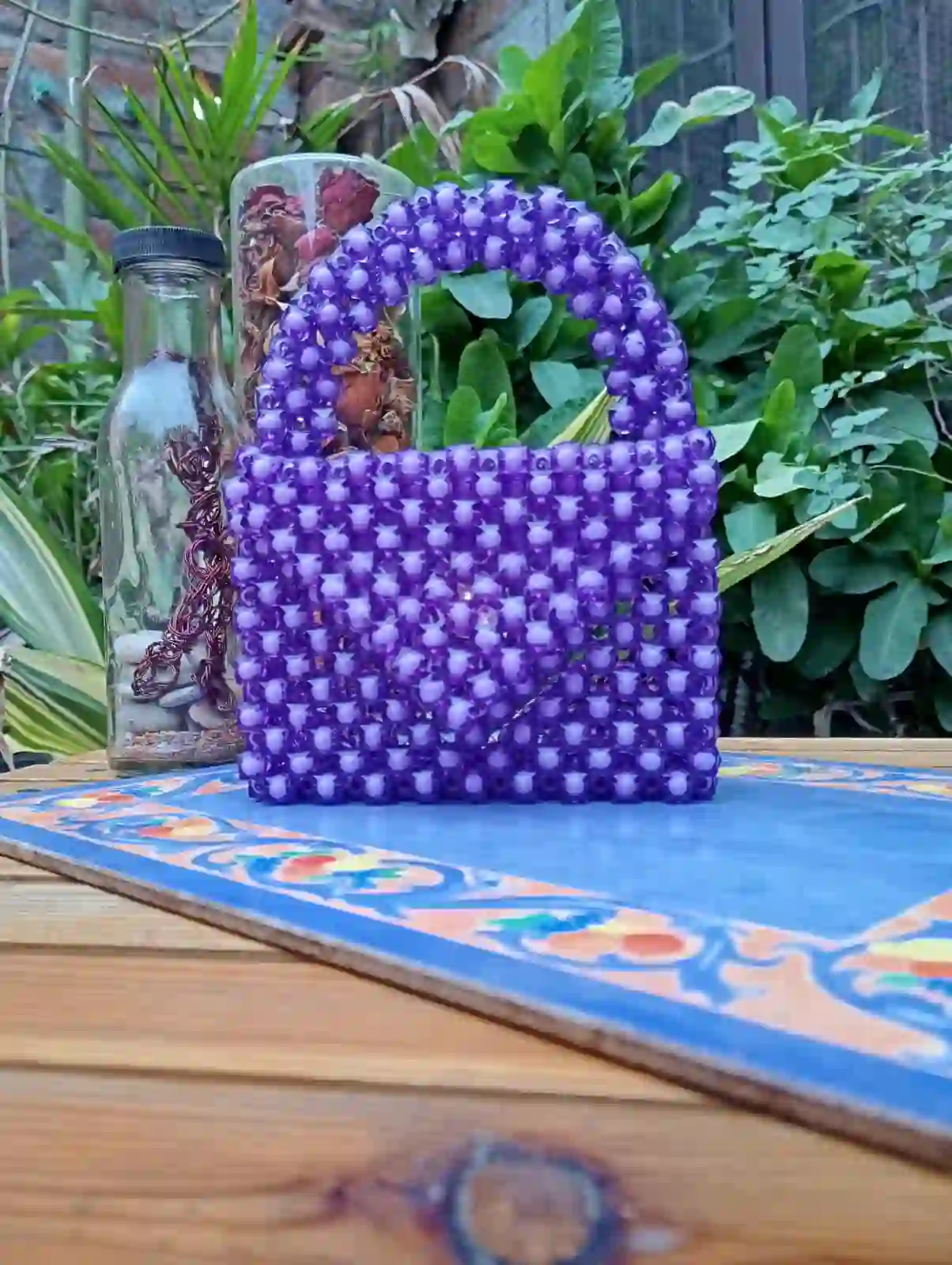“description”: “Elevate you style with Purple Mini Beaded Bag – handcrafted with matching beaded handle, perfect for casual outings, and parties. Buy now at MyBeadsPk!”,